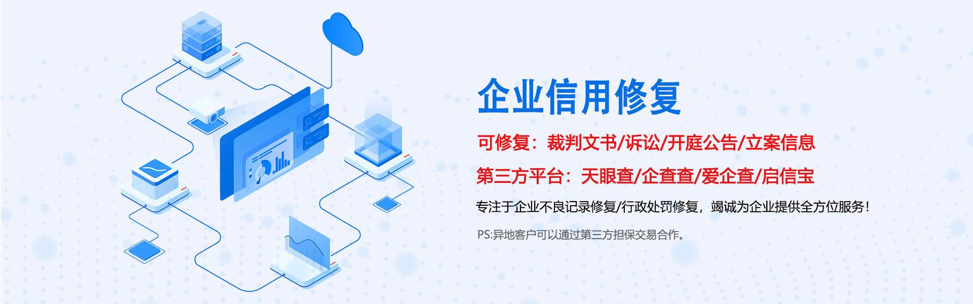 佰修網(wǎng)總部位于中國(guó)上海,公司始終以服務(wù)好客戶為己任,擁有多年的企業(yè)信用修復(fù)經(jīng)驗(yàn),我們擅長(zhǎng)企業(yè)司法案件,企業(yè)裁判文書,企業(yè)不良記錄,企業(yè)環(huán)保處罰,企業(yè)行政處罰修復(fù),第三方平臺(tái):企查查/天眼查/企信寶/愛企查/企信寶/水滴信用等。還有工商稅務(wù)等級(jí)/各部門處罰等。